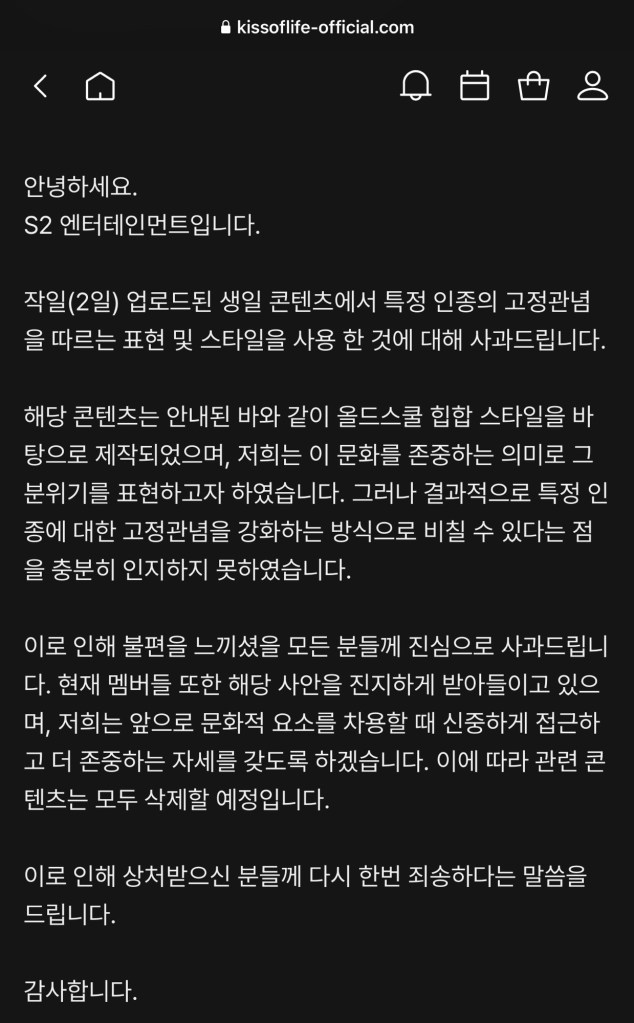 We’d like to address the issues that arose from the content that was uploaded on KISS OF LIFE’s official Youtube yesterday (April the 2nd).