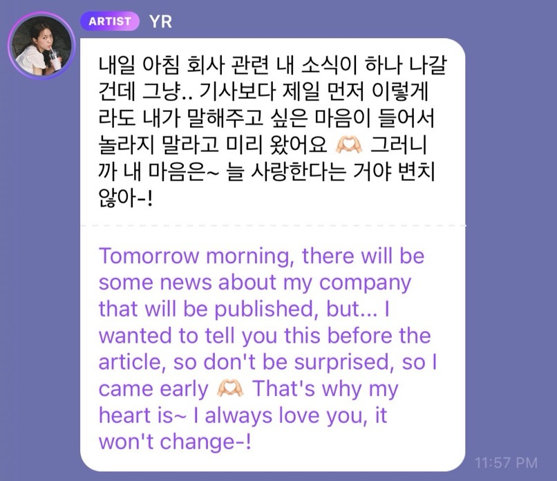 On a fan messaging platform, Yeri from Red Velvet warns fans that devastating news will be released in the morning.